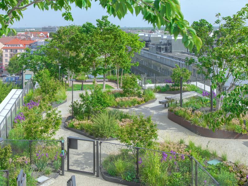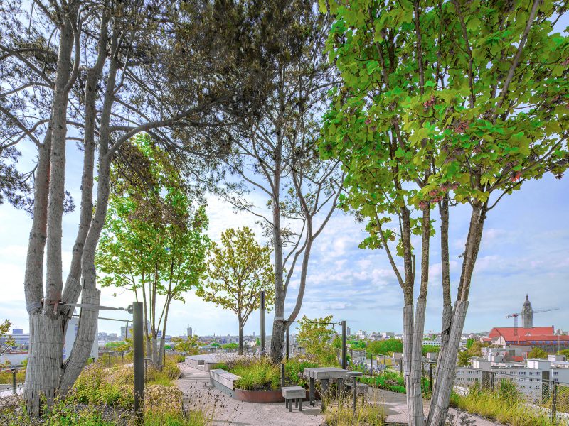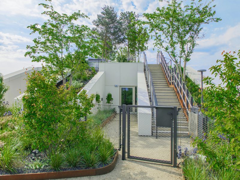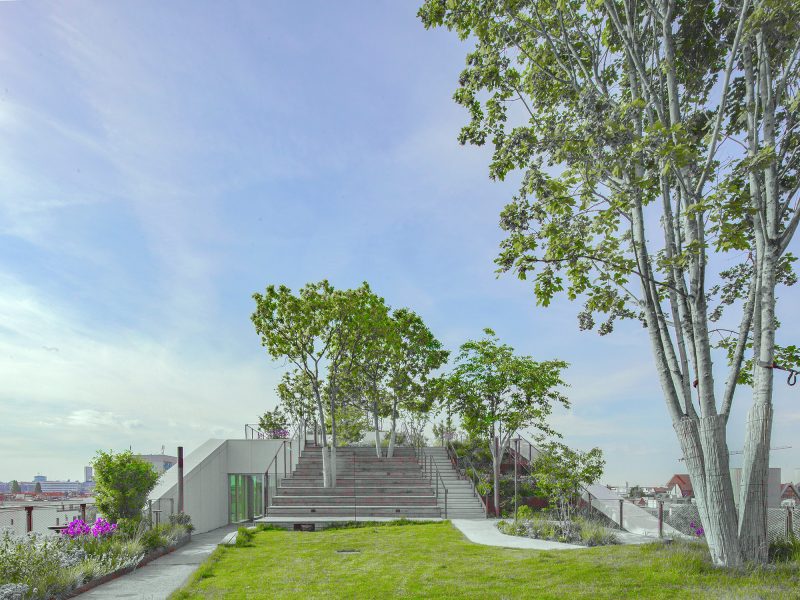 grüner und begehbarer Dachgarten mit spektakulärer Aussicht über den Fluss bis zum