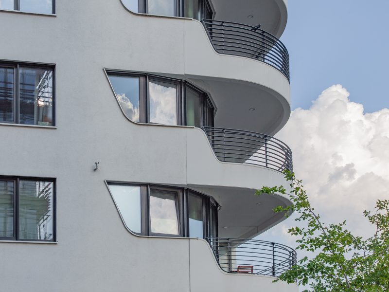 Das siebengeschossige Wohnhaus ist in eine Reihe von Geschäfts-und Bürogebäuden am