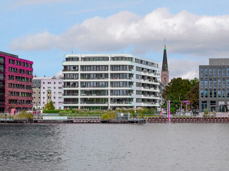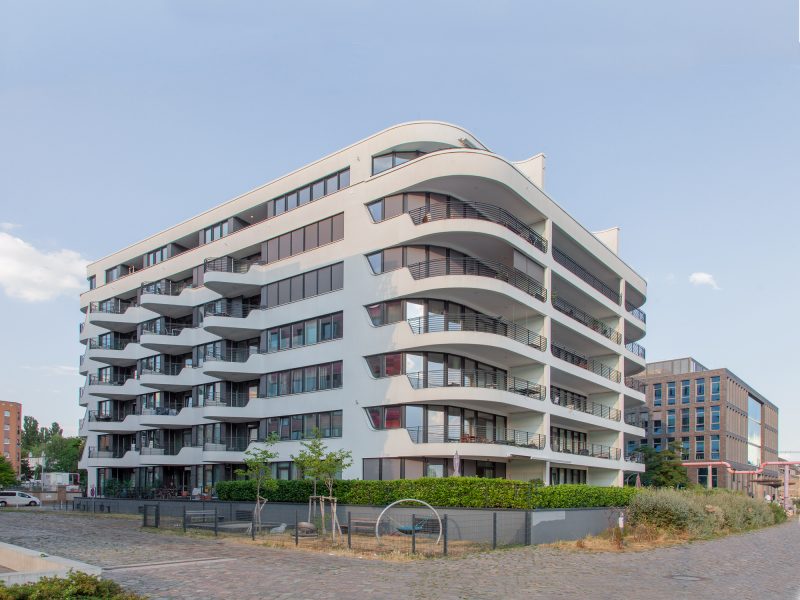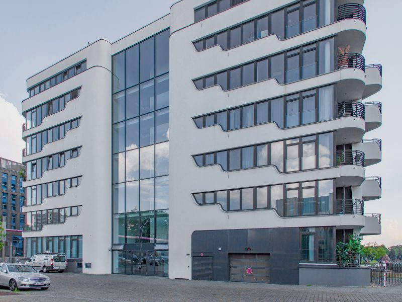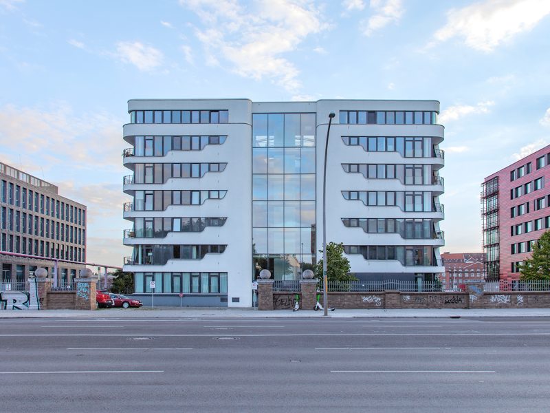 ehemaligen Berliner Osthafen integriert. Die formalen Bezüge zu einem Schiff
