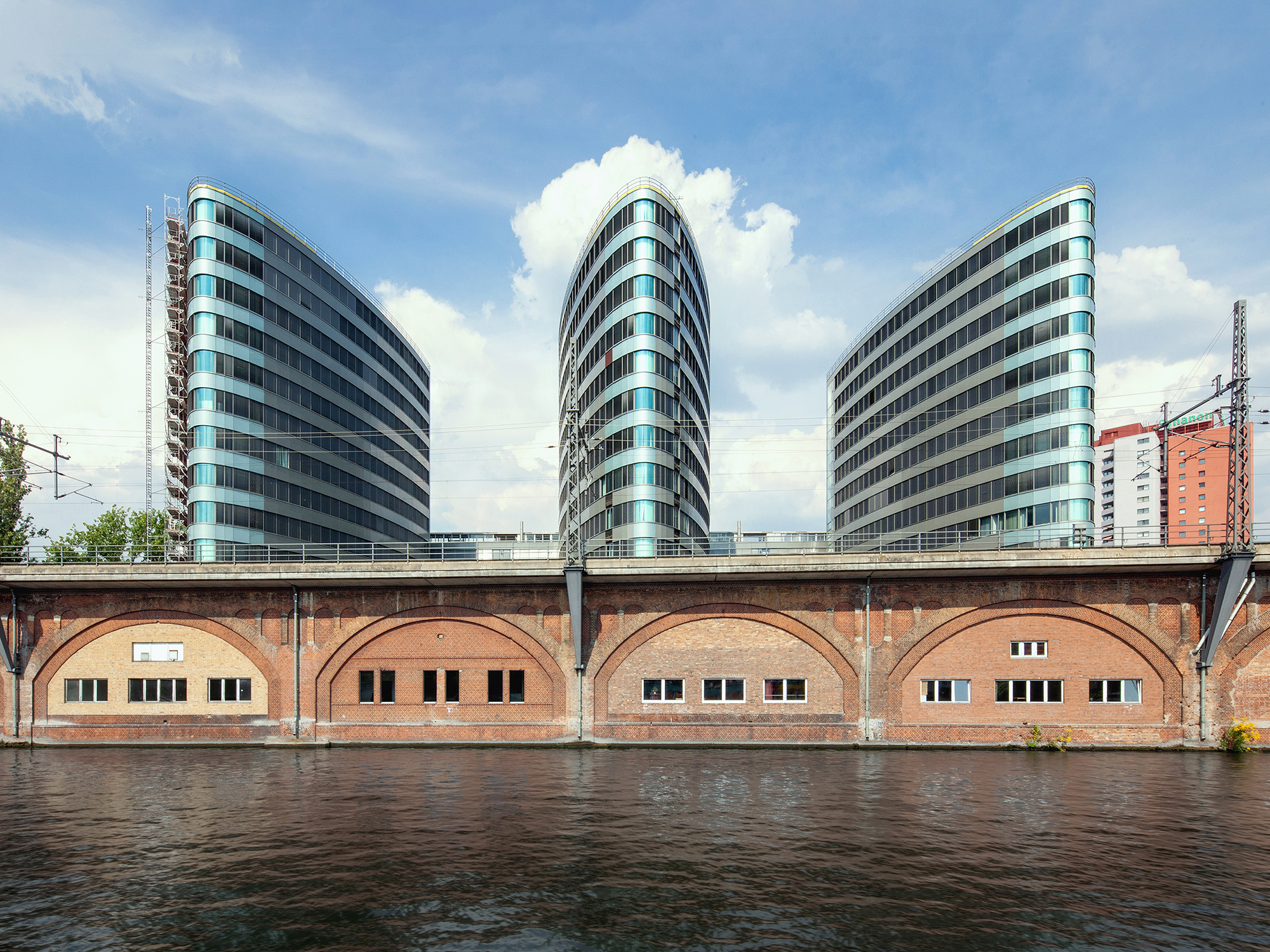 geschwungenen Stahl-Glas-Fassade am Spree-Nordufer in Berlin Mitte wurde